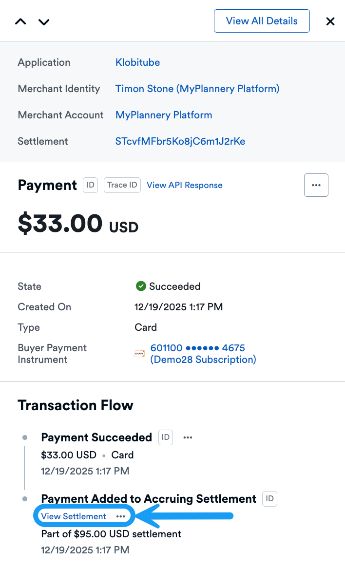 Follow these steps to view settlement details for a successful payment that was added to a settlement: