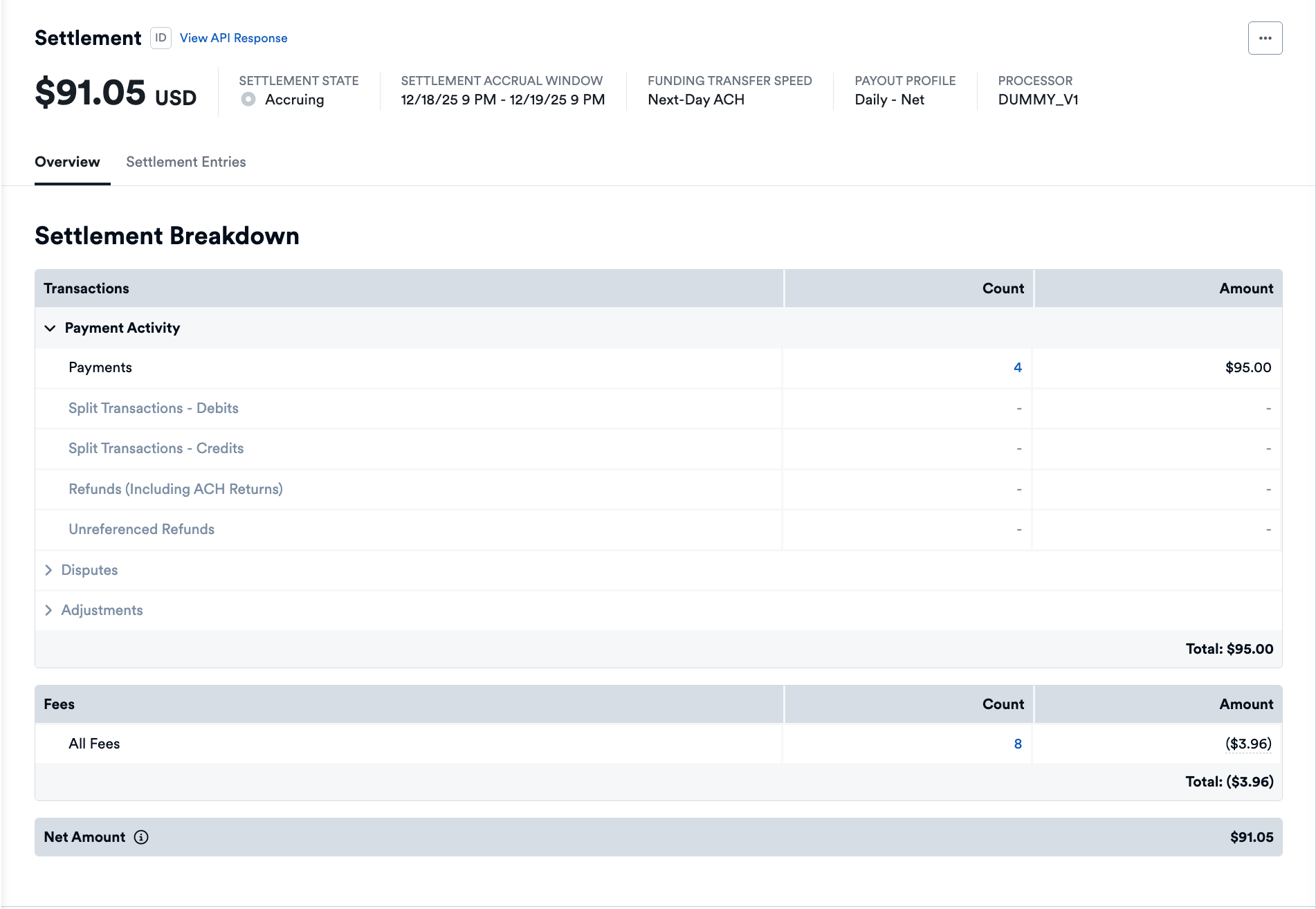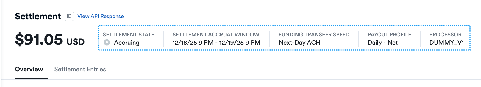 Funding Transfer Speed: (Visible only when settlement state is Accruing or Awaiting Approval) When you'll receive your payout after the accrual window closes.