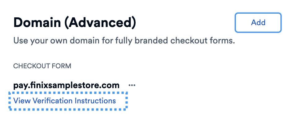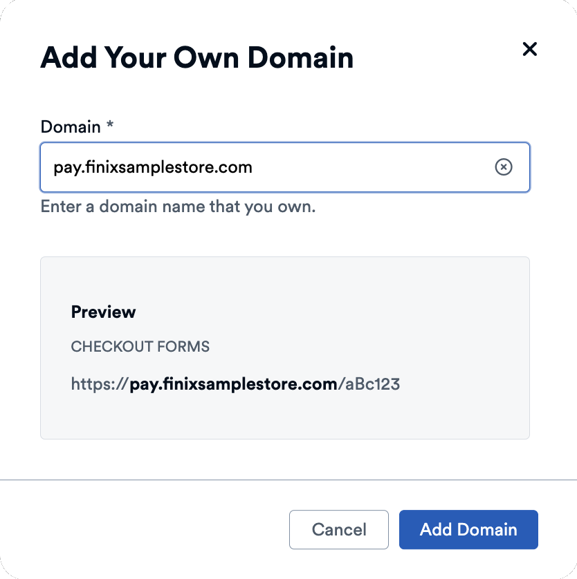 Adding a custom domain can help build customer confidence by showing your company name in the short links. Custom domains can be used on Finix's low-code solutions, including checkout forms, payment links, and subscription links.