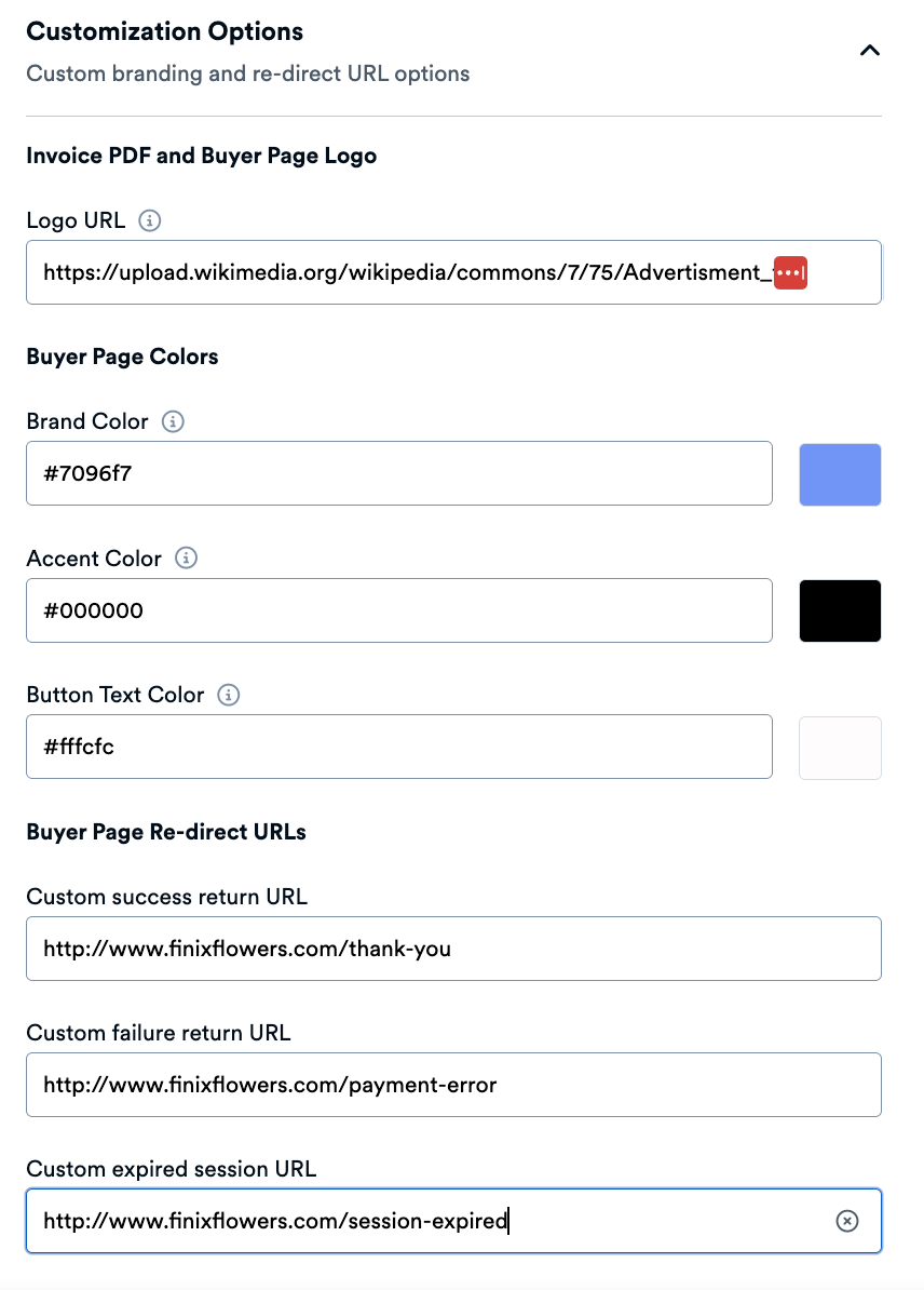 - Redirect URLs: Specify where buyers are sent after successful payment, failed payment, or session expiration.