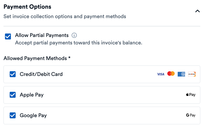 - Allowed Payment Methods: Select which payment options to accept (credit/debit card, Apple Pay, Google Pay).