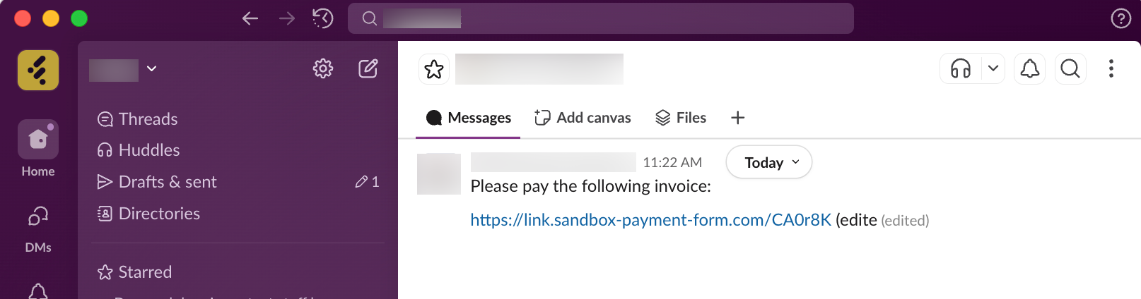 To share an invoice through Slack or another messaging app, copy the invoice URL. Your buyer can then use the link to pay.