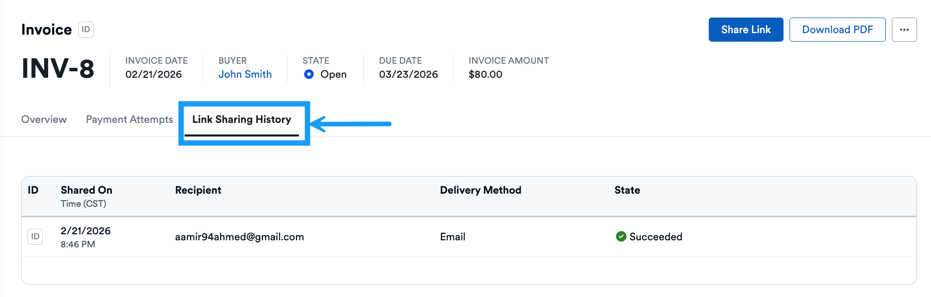 - From the invoice details page, click the Link Sharing History tab to view a record of all invoice shares.